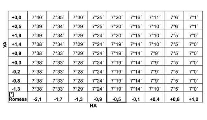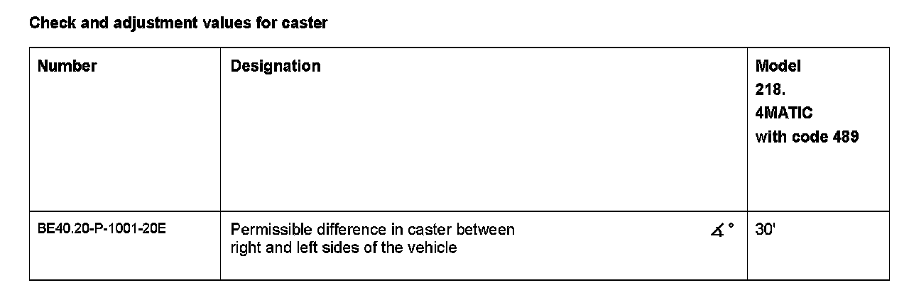 1 Obtain the caster value from the table taking into account the front axle (FA) level values and rear axle (RA) level values measured previously.