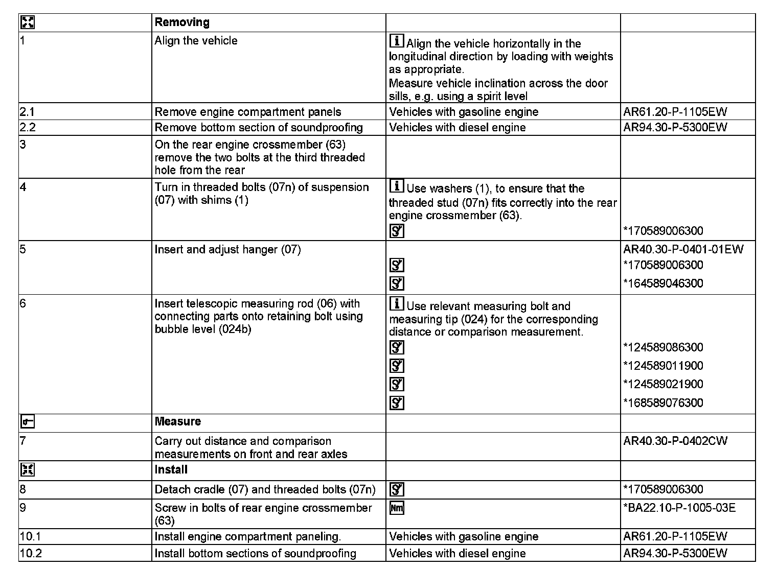 "k" Check bores for the suspension (third threaded hole from rear, of the two bolts on the rear engine crossmember)