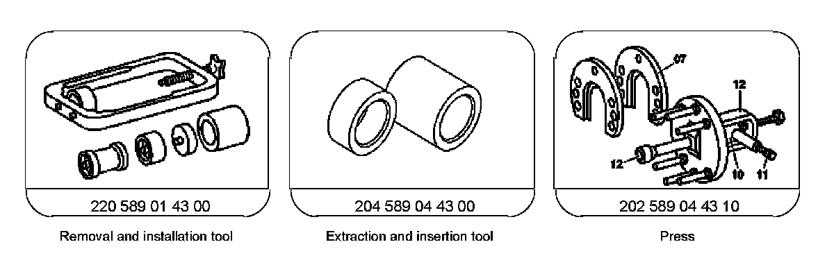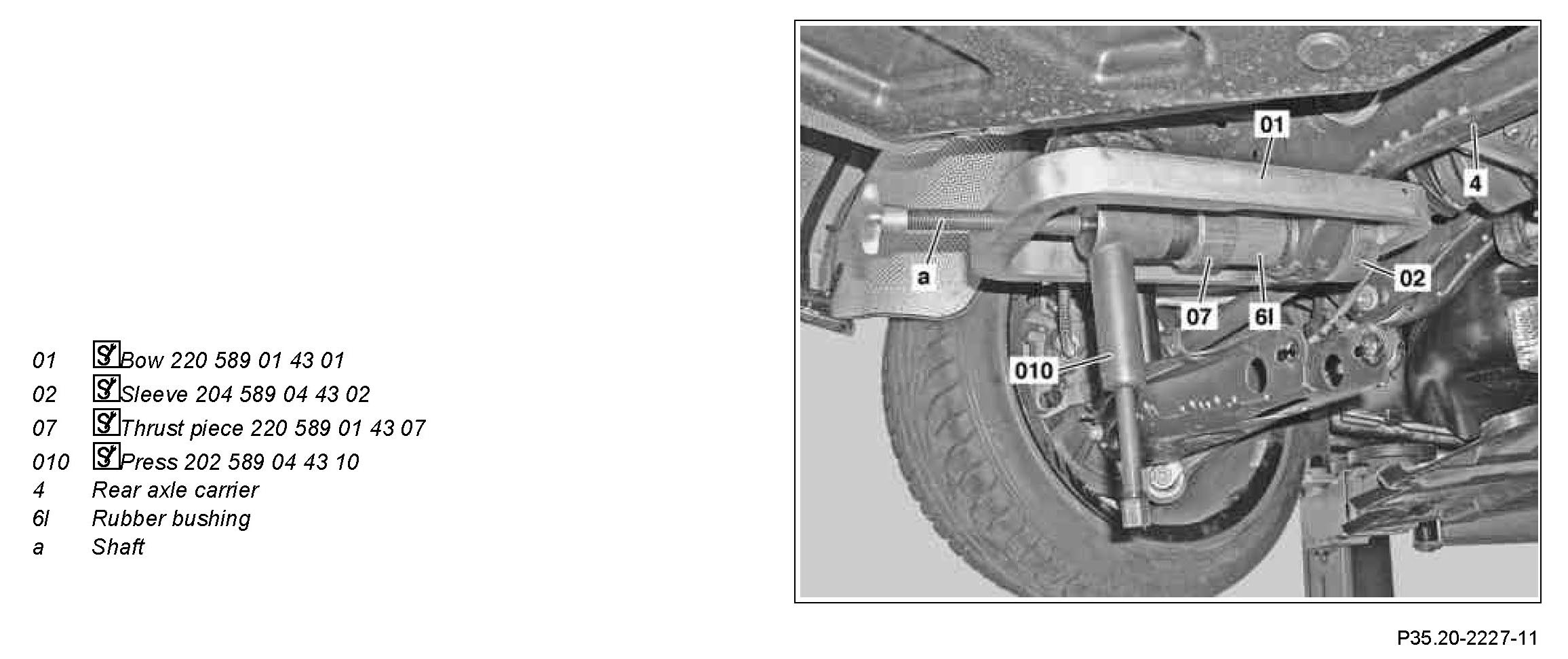2 Attach bracket (01) to rear axle carrier (4) and rubber mount (61) using sleeve (001), thrust piece (04) and press (010).