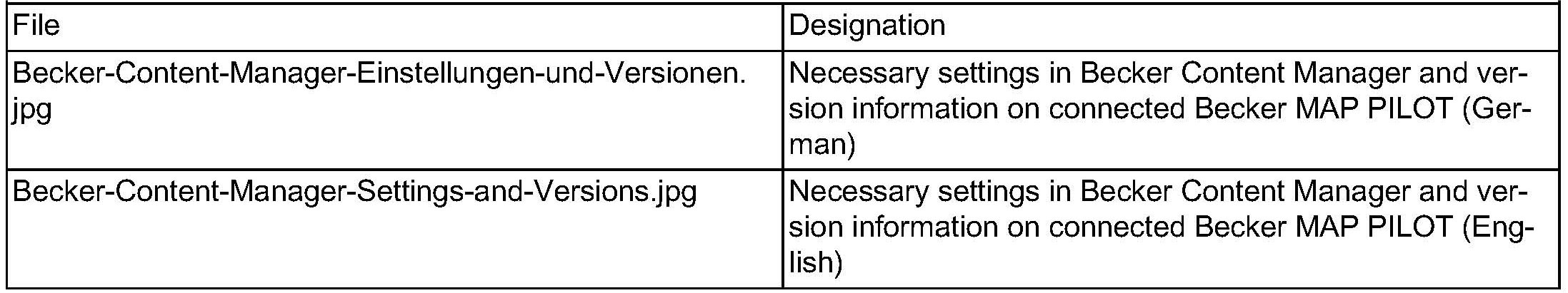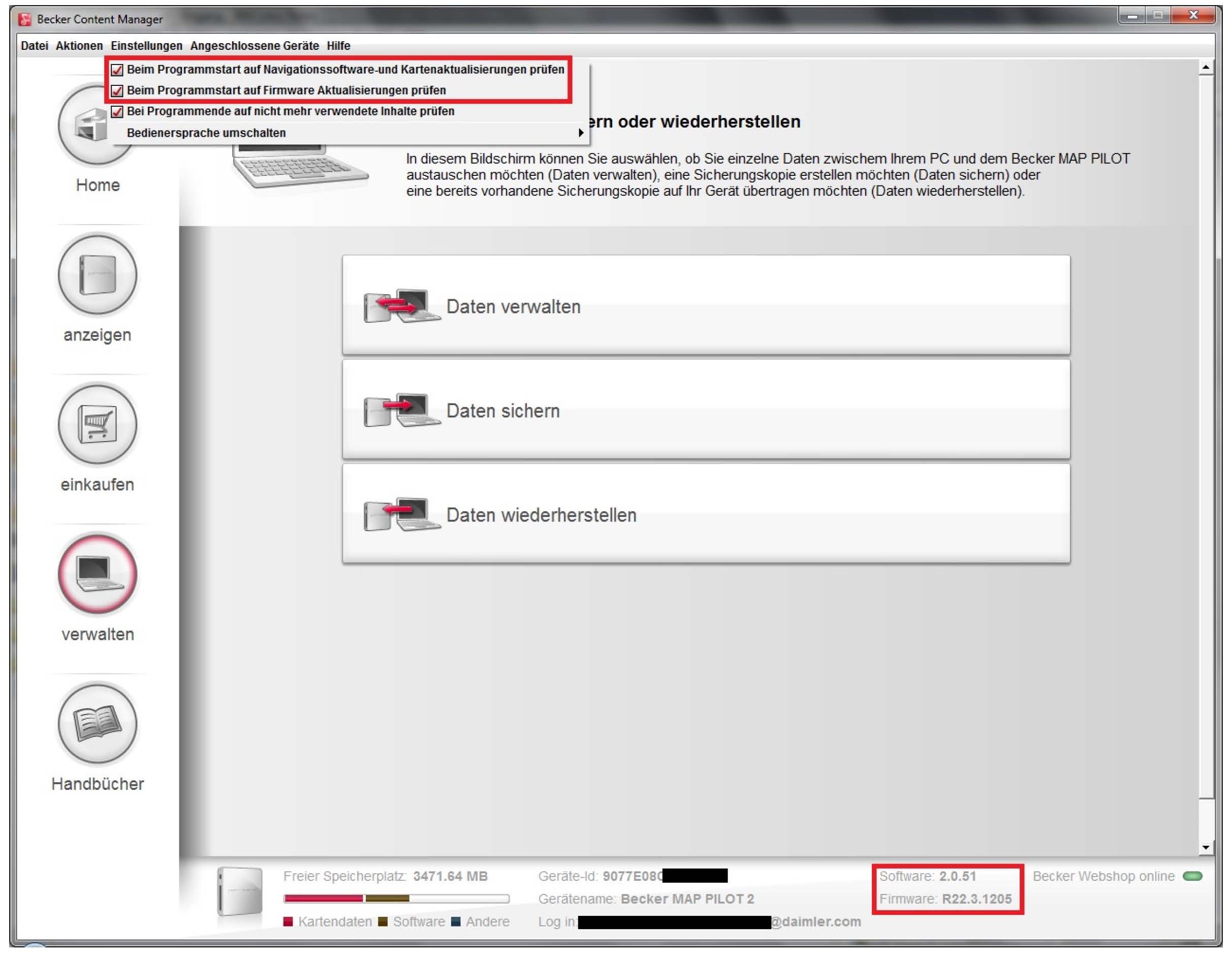 The updates of the navigation software (PND software) including firmware must be performed using the current Becker Content Manager. The checks for updates on launching the Becker Content Manager must be activated in the "Settings" menu (see attachment). To update the navigation software, it may be necessary to perform a free-of-charge update of the map data at the same time. Detailed information can be found at www.beckermappilot.com. The update process can take up to several hours depending on your Internet connection.