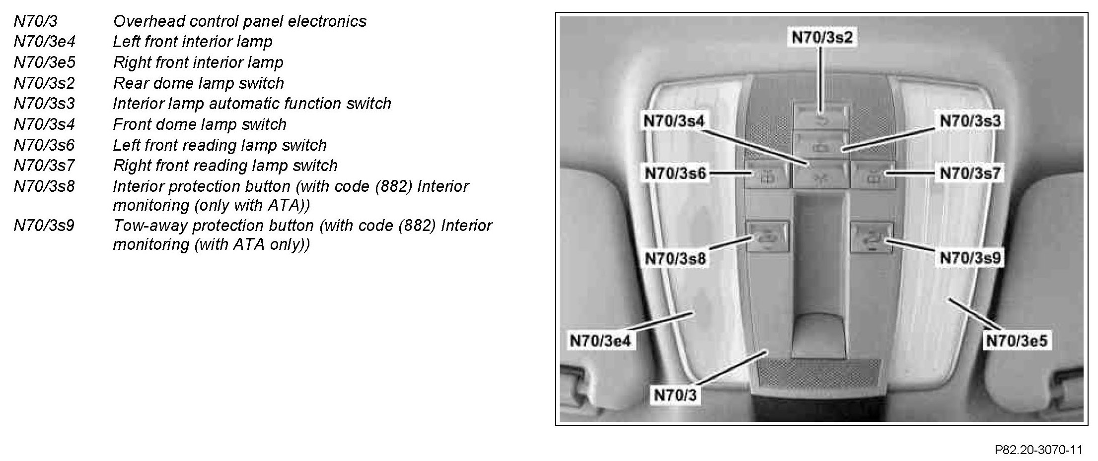 The controls on the electronic overhead control panel are used for manual interior lights control. The front SAM control unit with fuse and relay module (N10/1) supplies the overhead control panel electronics with voltage.