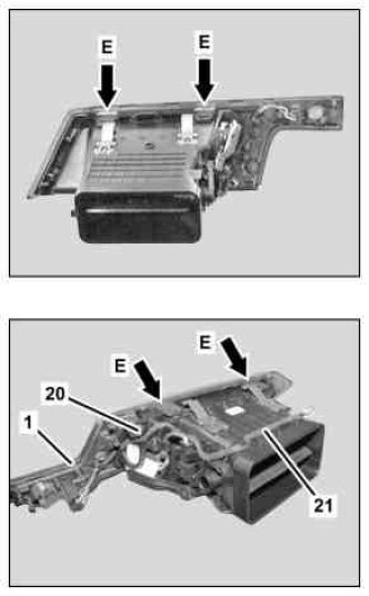 3 Unclip left air vent trim part (1) (arrows E) and remove.