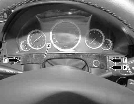 5 Unclip instrument cluster trim part (2) (arrows F) and remove.