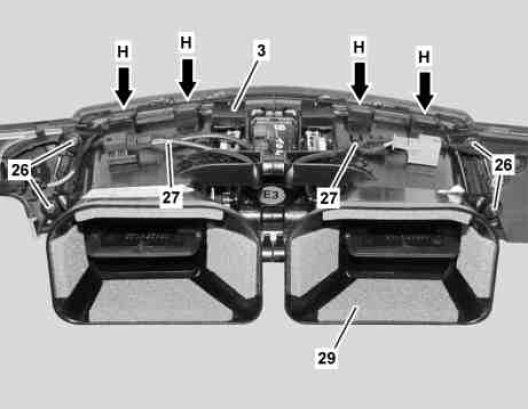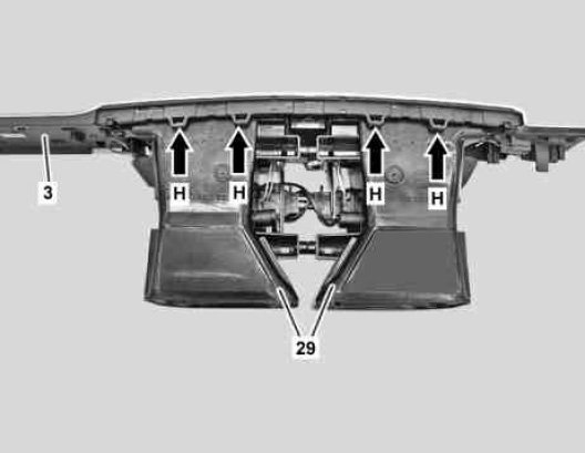 10 Unclip passenger side trim part (3) from top from center air vent (29) (arrows H).