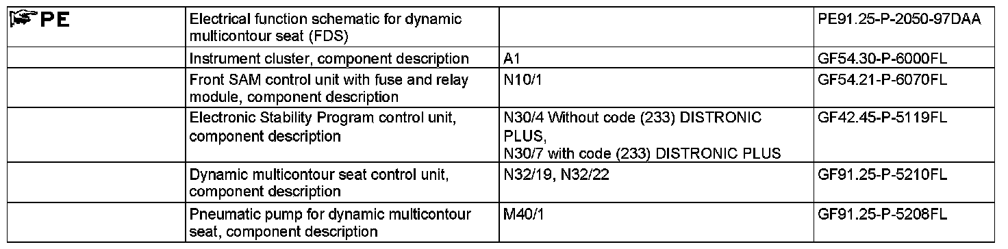 Depending on the vehicle speed and lateral acceleration, the left front dynamic multicontour seat control unit (N32/19) actuates the valves of the lateral support air cushions. These data is transmitted via the interior CAN by the front SAM control unit with fuse and relay module (N10/1), which acts as gateway and the data is routed by the electronic stability program control unit (N30/4) (vehicles without code (233) DISTRONIC PLUS) or electronic stability program control unit Premium (N30/7) (vehicles with code (233) DISTRONIC PLUS).