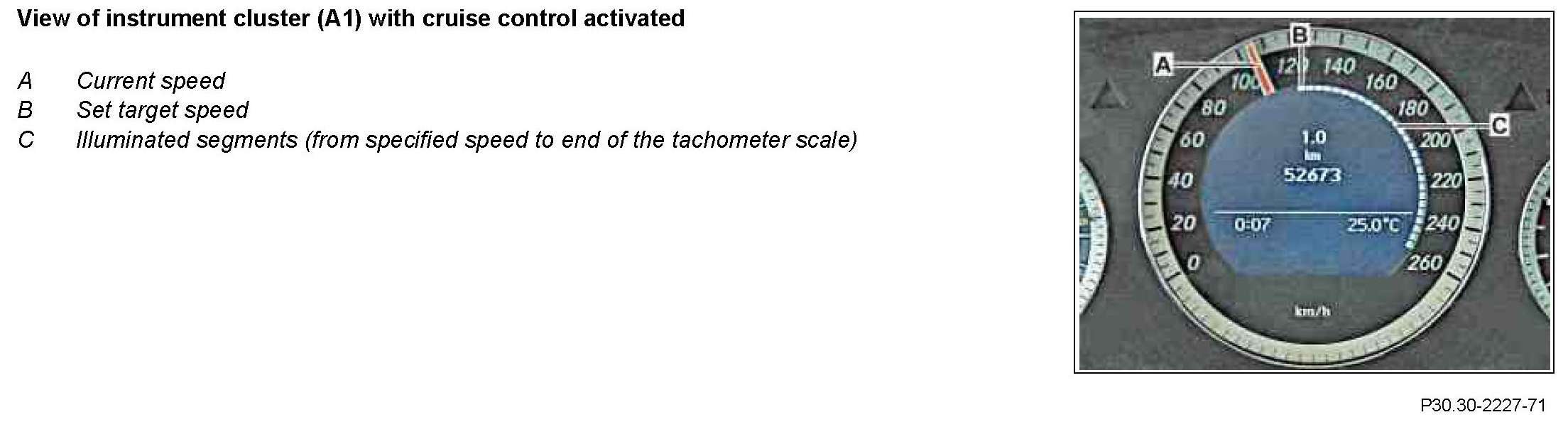 If the cruise control is activated, the segments in the speedometer (A1p8) are illuminated from specified speed to end of the tachometer scale.
