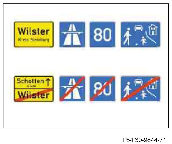 Information on the classification of roads and on built-up areas is derived from the radio with Auto-Pilot-System or from the navigation data provided by the COMAND controller unit. By this means the system recognizes that the vehicle is leaving a road for which a speed limit identified earlier was displayed. Since the picture recognition system is unable to cancel the display of a speed limit identified outside a town/village when passing a town/ village entry sign, use is made of the navigation data.