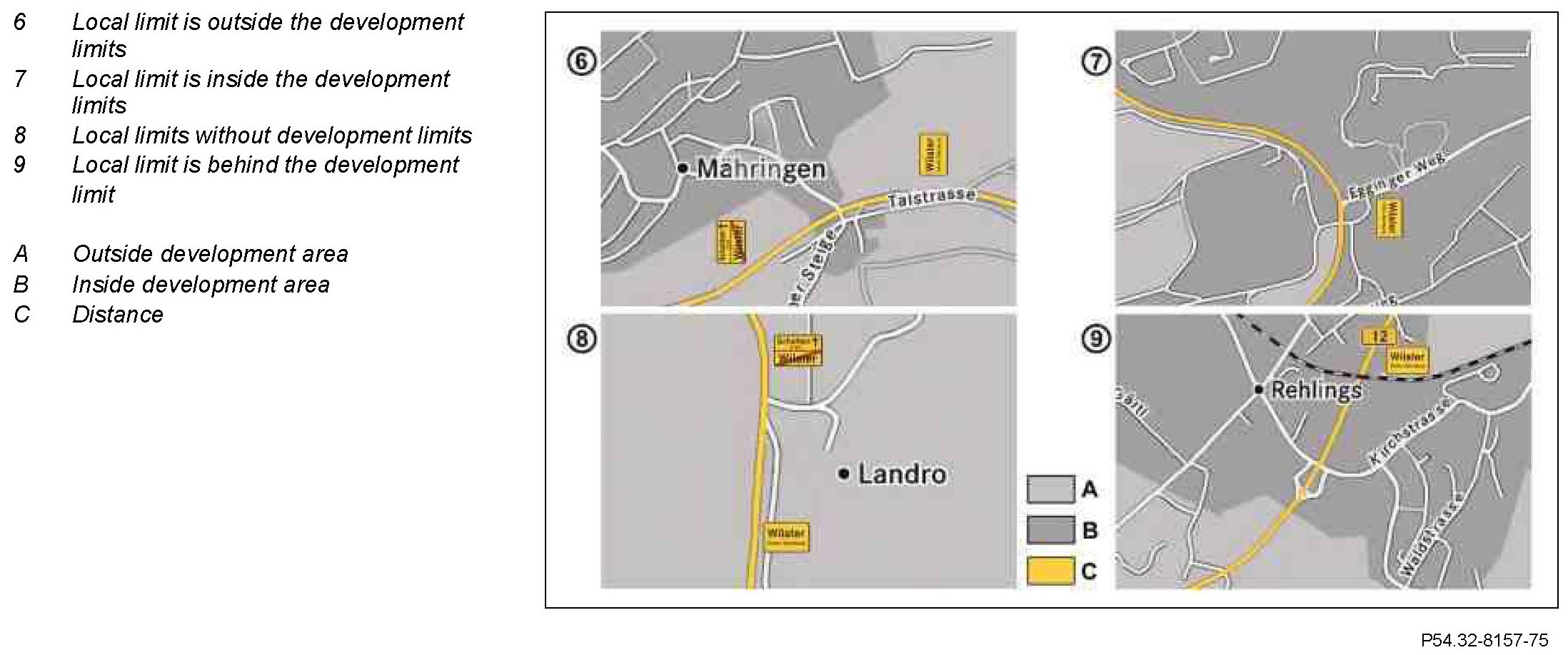 Since the town/village borders do not always coincide with the markings for buildings on the navigation map, it may happen that the display of the last identified speed limit is either removed too early or continues to show inside the official town/village area.