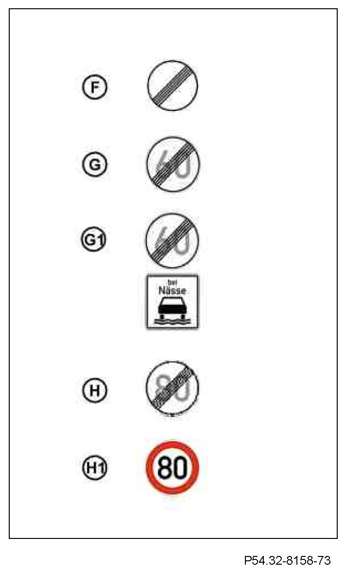 - Passing a derestriction sign with speed limit value (picture G), which deviates from the speed limit value of the traffic sign as previously documented (picture H1).