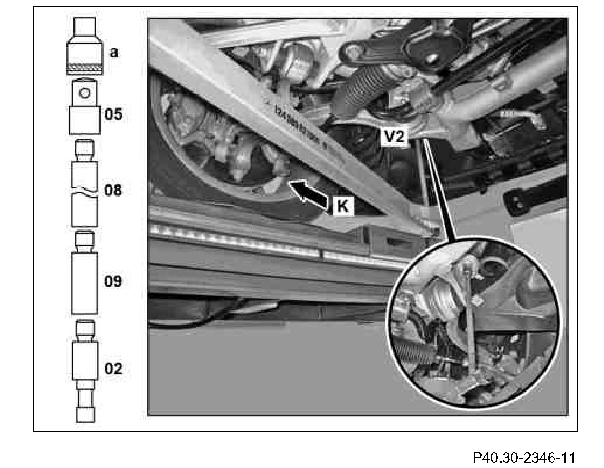 1 Measure distance dimension (V1) from check point (K) to center of Torx(R) bolt head of rear mount of front axle carrier. Measure on the left and right side in each case.