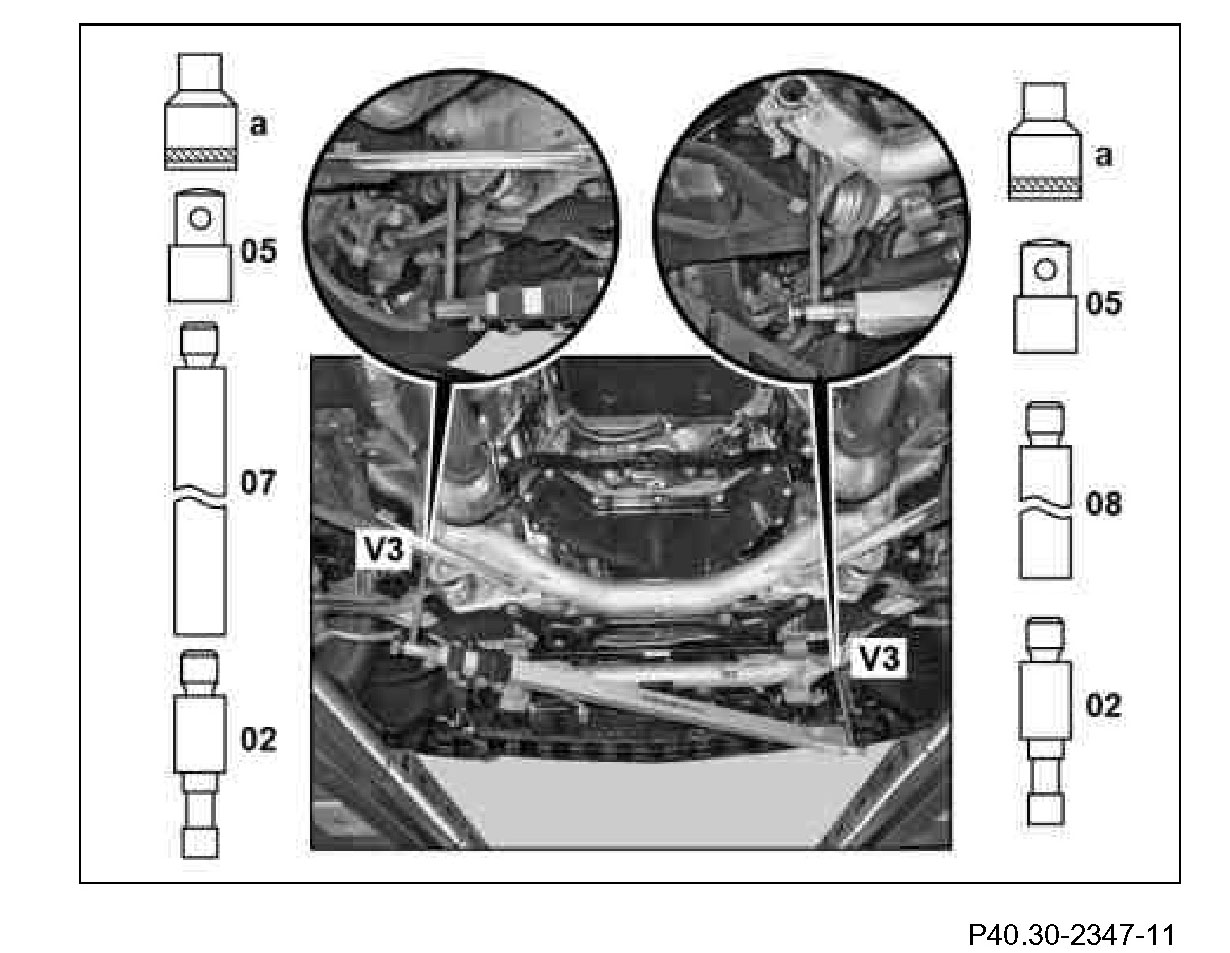 3 Measure distance dimensions (V3) diagonally between the centering point of the Torx(R) bolt heads of the front and rear mount of the front axle carrier.