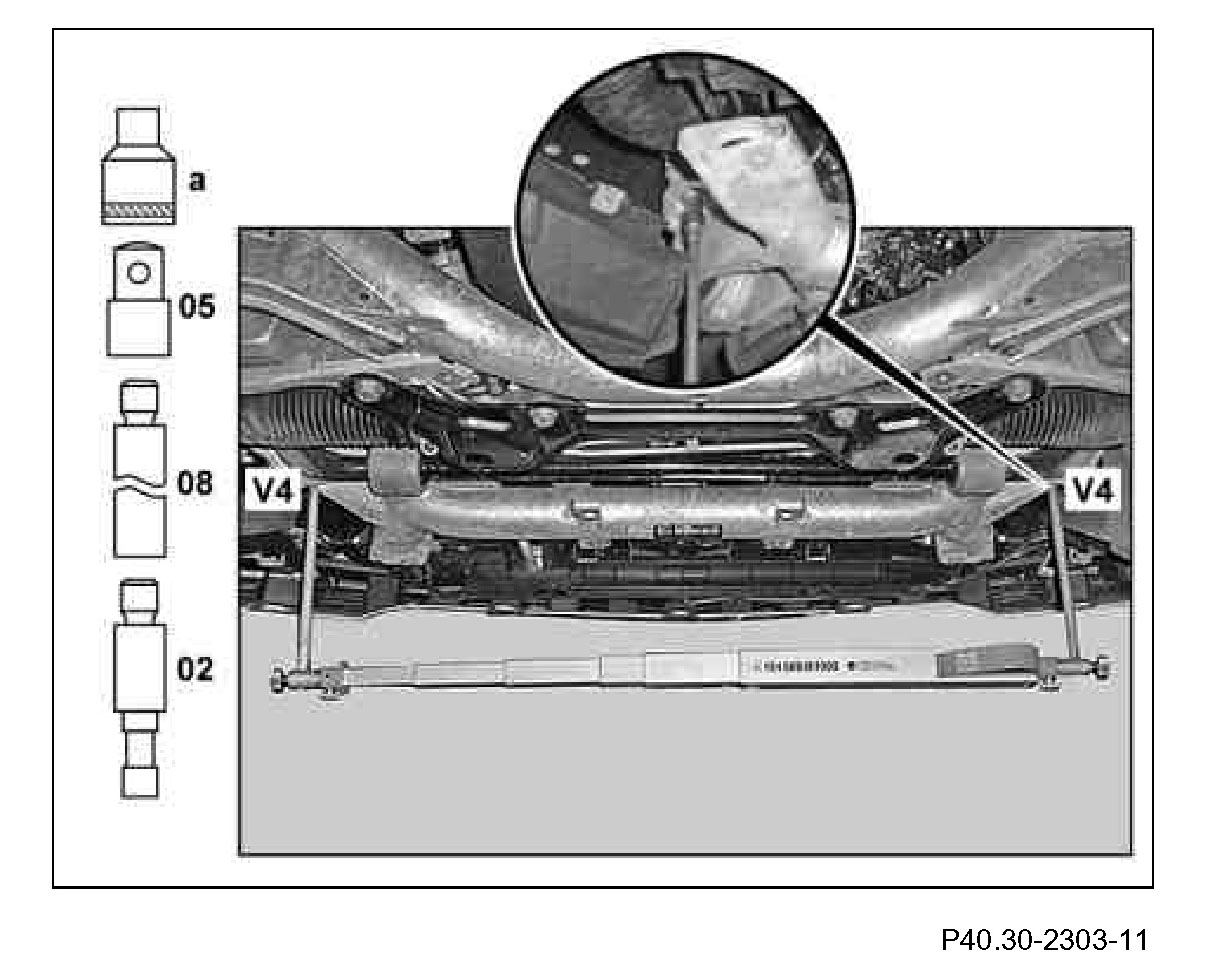 4 Measure distance dimension (V4) from the centering point of the Torx(R) bolt heads between the front bearings of the front axle carrier.