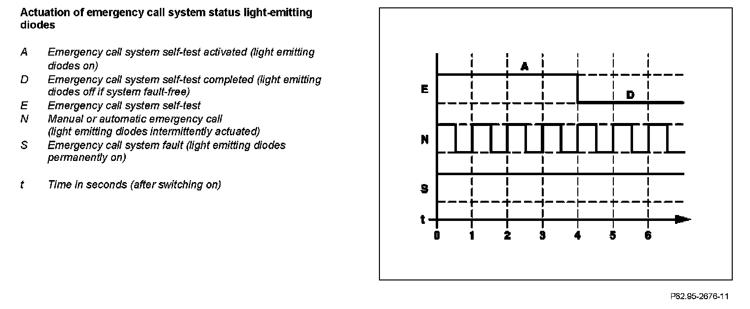 If no fault is present, the two red light-emitting diodes integrated in the emergency call system button go out after approx. t = 4 s and thereby signal operational readiness of the emergency call system If a fault is present, the two red light-emitting diodes integrated in the emergency call system button are permanently actuated by the emergency call system control unit via a direct line. Depending on the fault type, a message is displayed in the instrument cluster and filed in the memory of the emergency call system control unit.