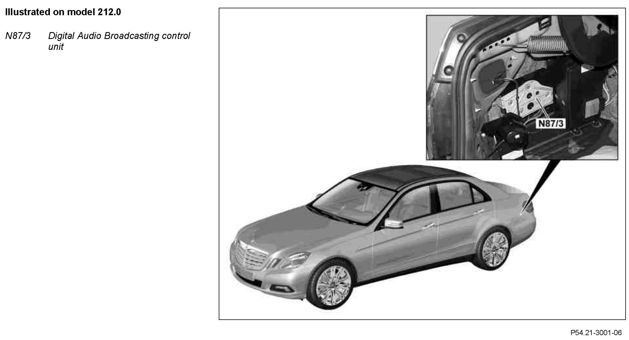 The Digital Audio Broadcasting control unit is located in the trunk at the left under the trunk paneling on the sidewall.