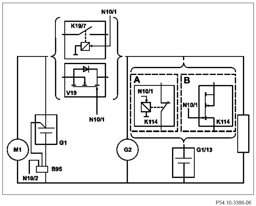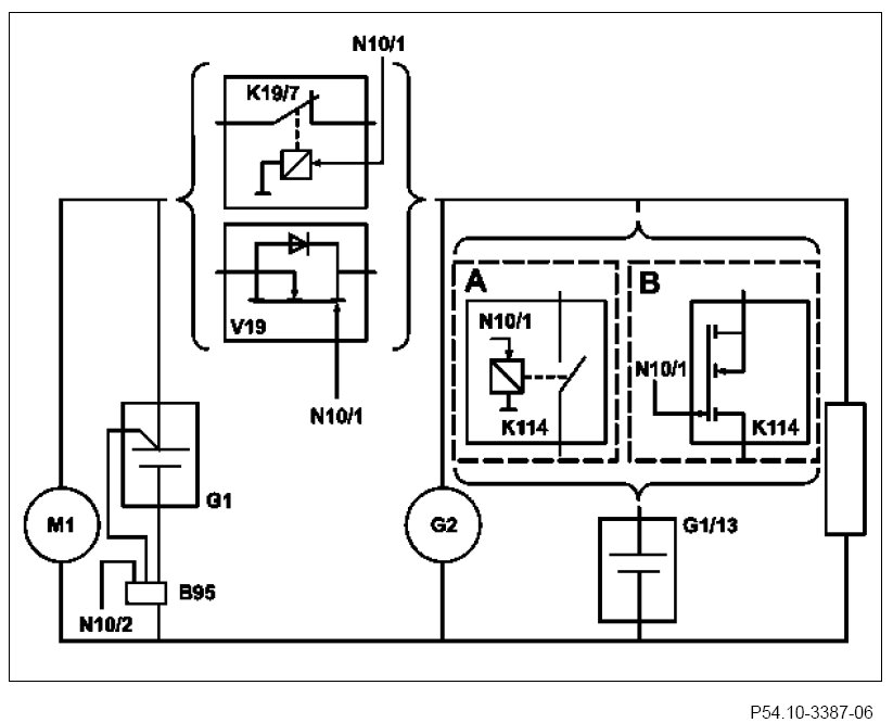 The on-board electrical system battery is decoupled from the on- board electrical system on vehicles with manual transmission through the on-board electrical system decoupling relay (K19/7) and for vehicles with automatic transmission by the ECO start/stop function diode (V19).