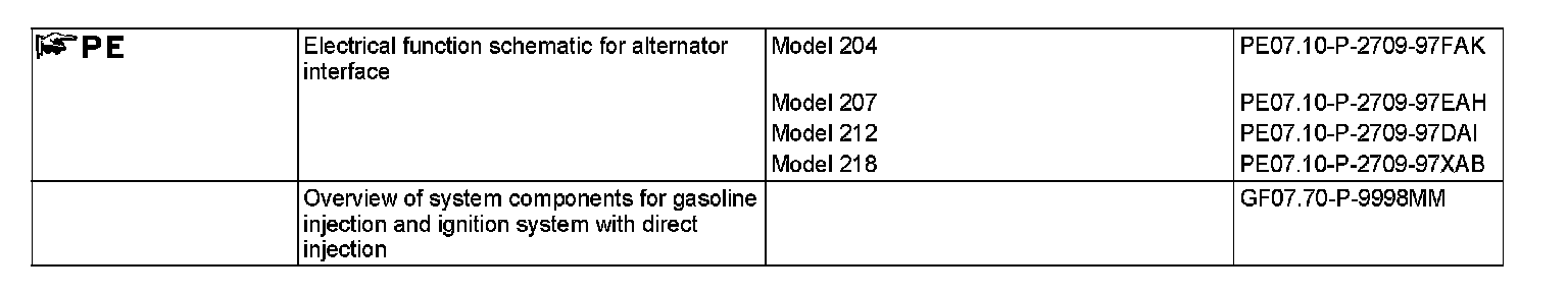 Using the alternator interface messages (e.g. the dynamo field monitor signal) are exchanged via the drivetrain LIN (LIN C1) between the alternator (G2) and the ME-SFI control unit (N3/10) and the control response of the alternator is controlled. To do this there is delayed adaptation of the regulation voltage for a larger change in load of the alternator. The current operating rate of the alternator is transmitted by the dynamo field monitor signal. The maximum data transmission rate between the ME-SFI control unit and the LIN control for the alternator is 19.2 kbit/s. The LIN control is not fitted with any direct outlets. The ME-SFI [ME] control unit reads in the following sensor and signals: