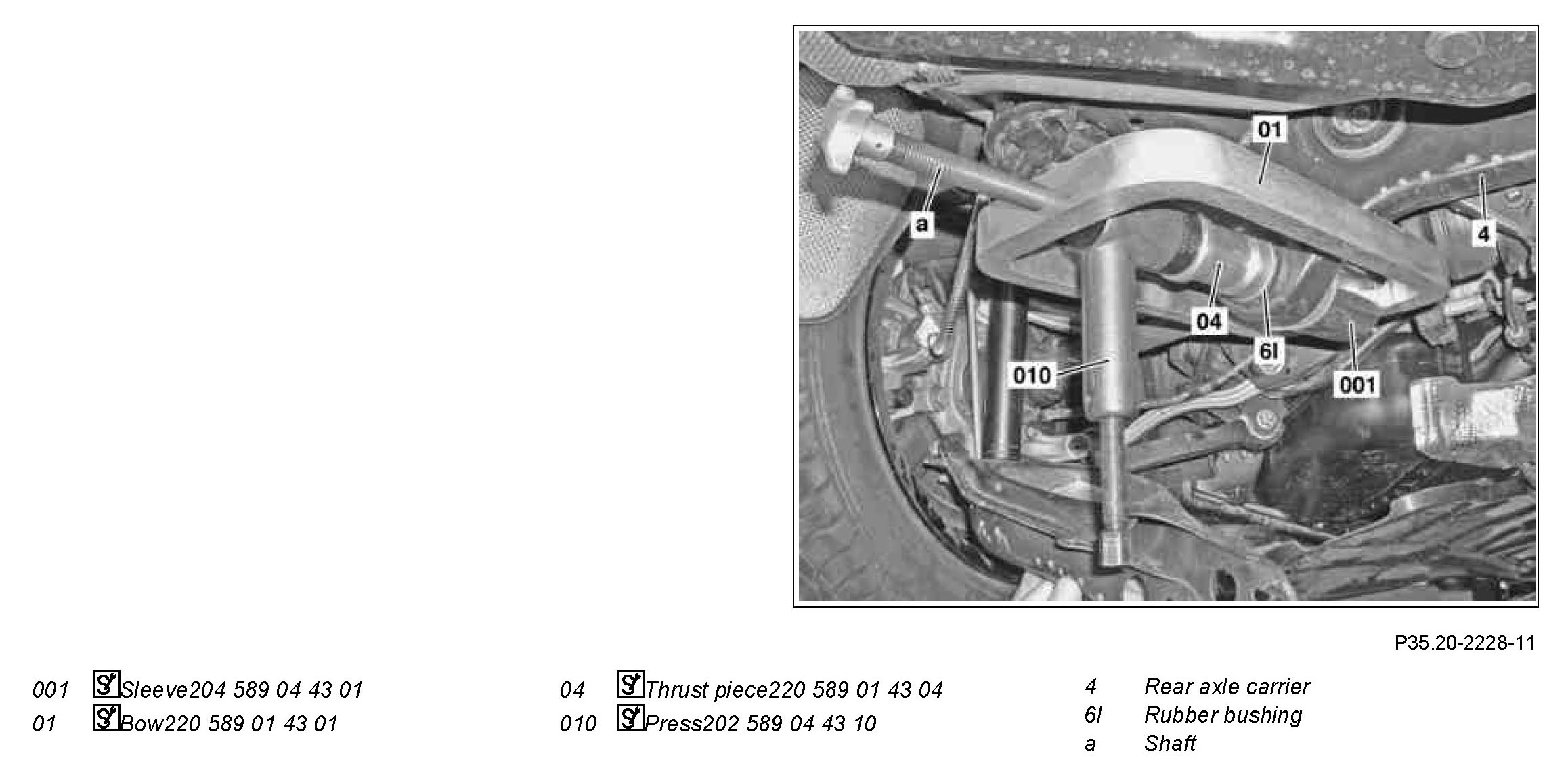 2 Attach bracket (01) to rear axle carrier (4) and rubber mount (61) using sleeve (001), thrust piece (04) and press (010).