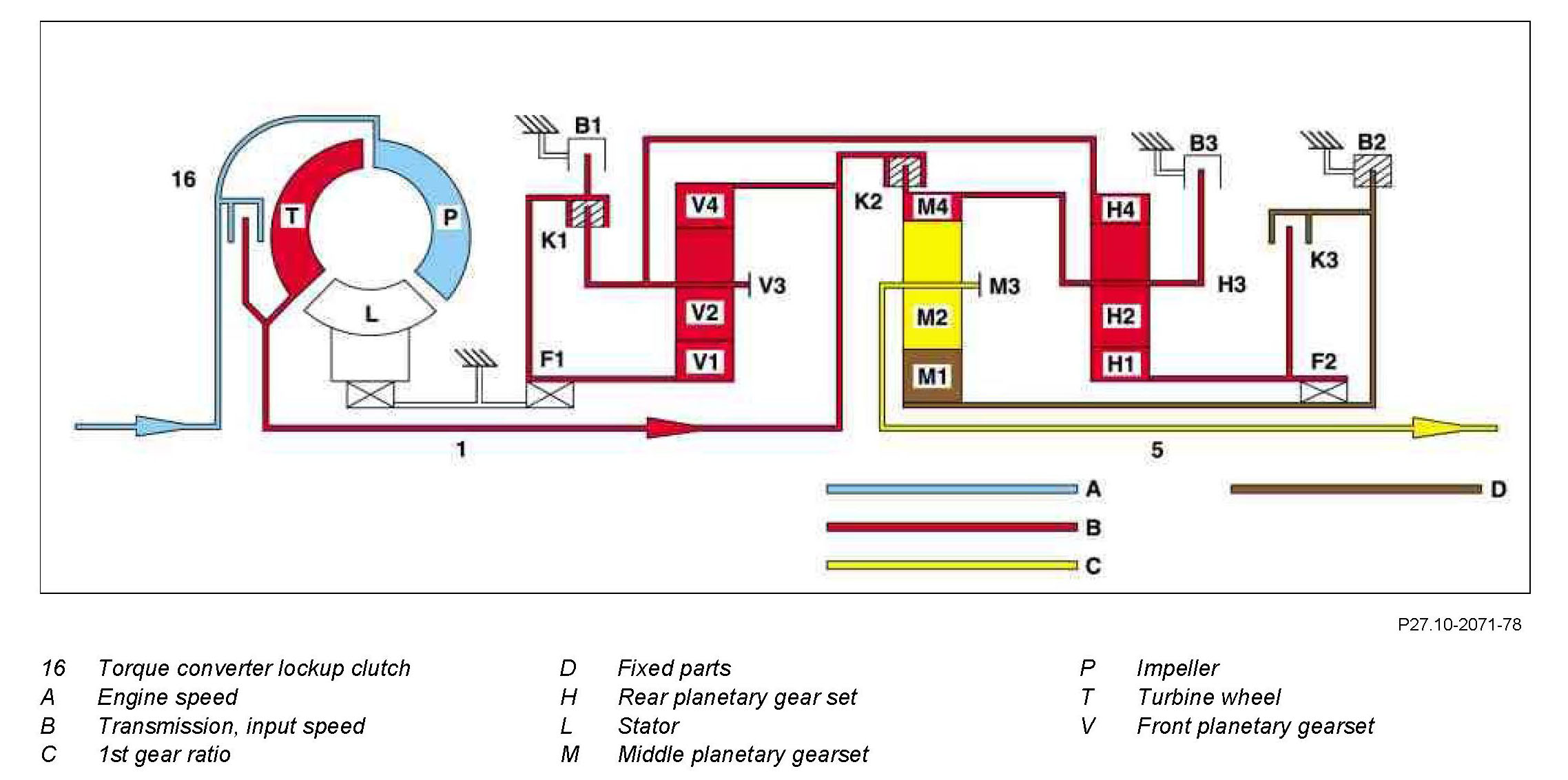 Torque from the torque converter is increased via the propeller shaft (1) and the center planetary gearset and transferred to the output shaft (5)."