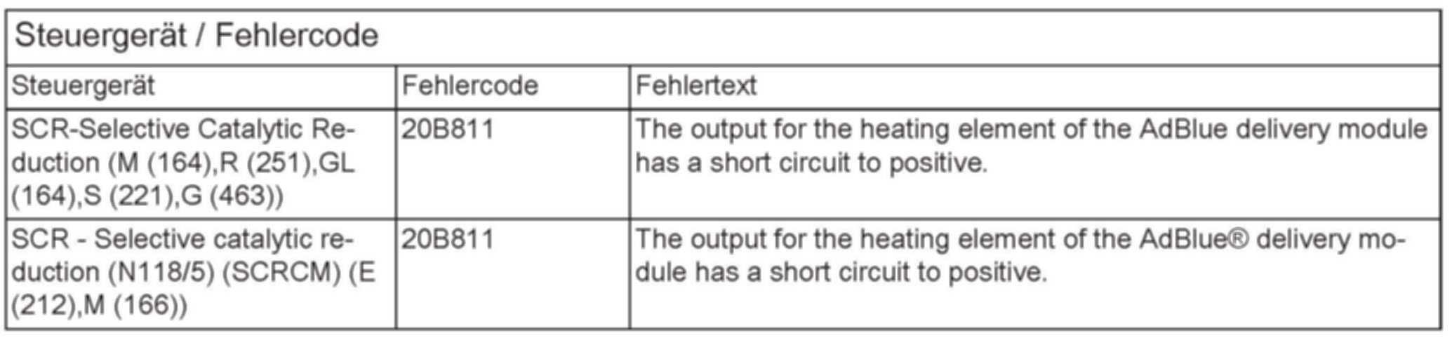 Fault code 20B811 (The output for the heating element of the Ad Blue delivery module has a short circuit to positive) is stored in the AdBlue control unit