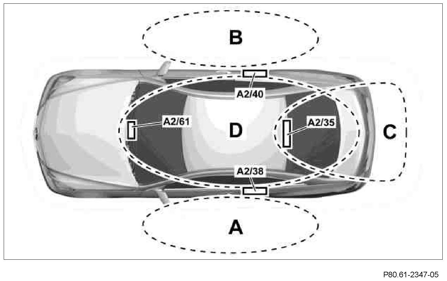 A position determination of the transmitter key is required for the individual functions. The transmitter key can determine in which area (A, B, C or D) it is located by activating the following components:
