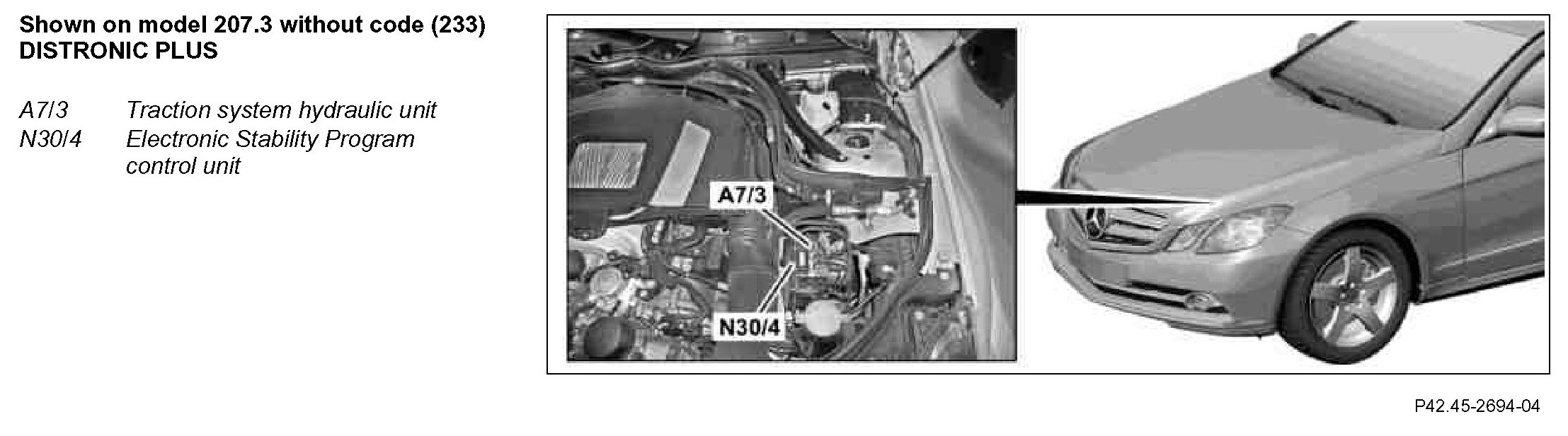 The Electronic Stability Program control unit (except code (233) DISTRONIC PLUS) or Electronic Stability Program Premium control unit (N30/7) (with code (233) DISTRONIC PLUS) is located in the left front of the engine compartment on the traction system hydraulic unit.