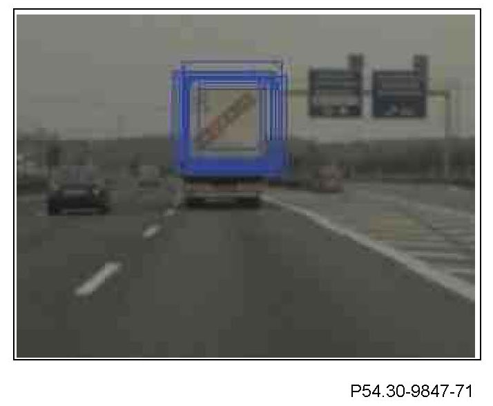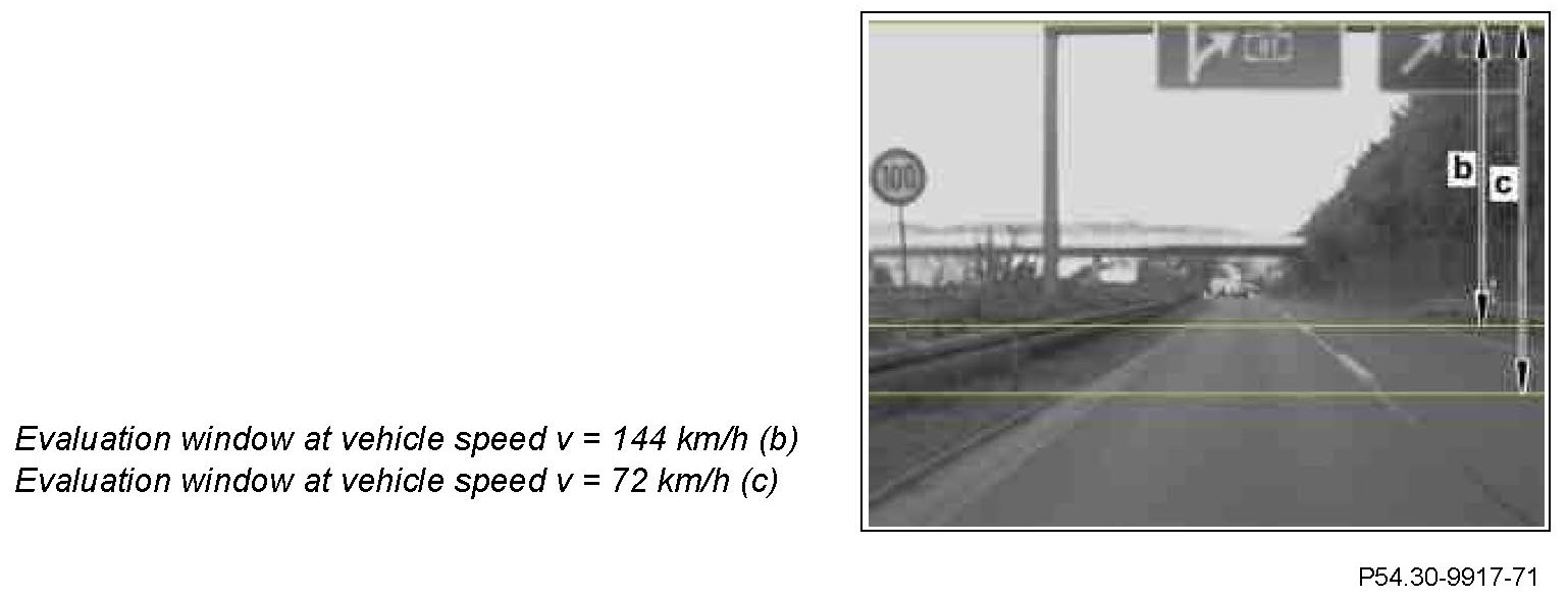 In order to keep the recognition safety homogenous over all speed ranges, the evaluation window is reduced in size as the vehicle speed reduces. The consequence of limiting the evaluation window of the multifunction camera is that traffic signs installed low down, as used in construction sites, are "missed" if they are passed at high speed.