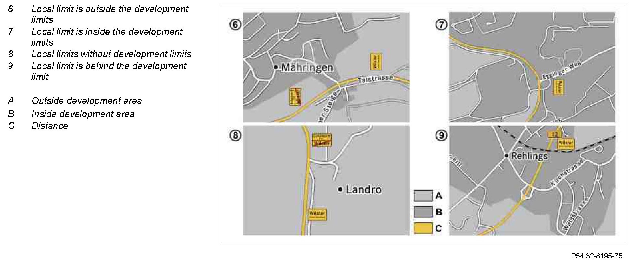Information on the classification of roads and on built-up areas is derived from the radio with Auto-Pilot-System or from the navigation data provided by the COMAND controller unit. By this means the system recognizes that the vehicle is leaving a road for which a speed limit identified earlier was displayed. Since the picture recognition system is unable to cancel the display of a speed limit identified outside a town/village when passing a town/ village entry sign, use is made of the navigation data.