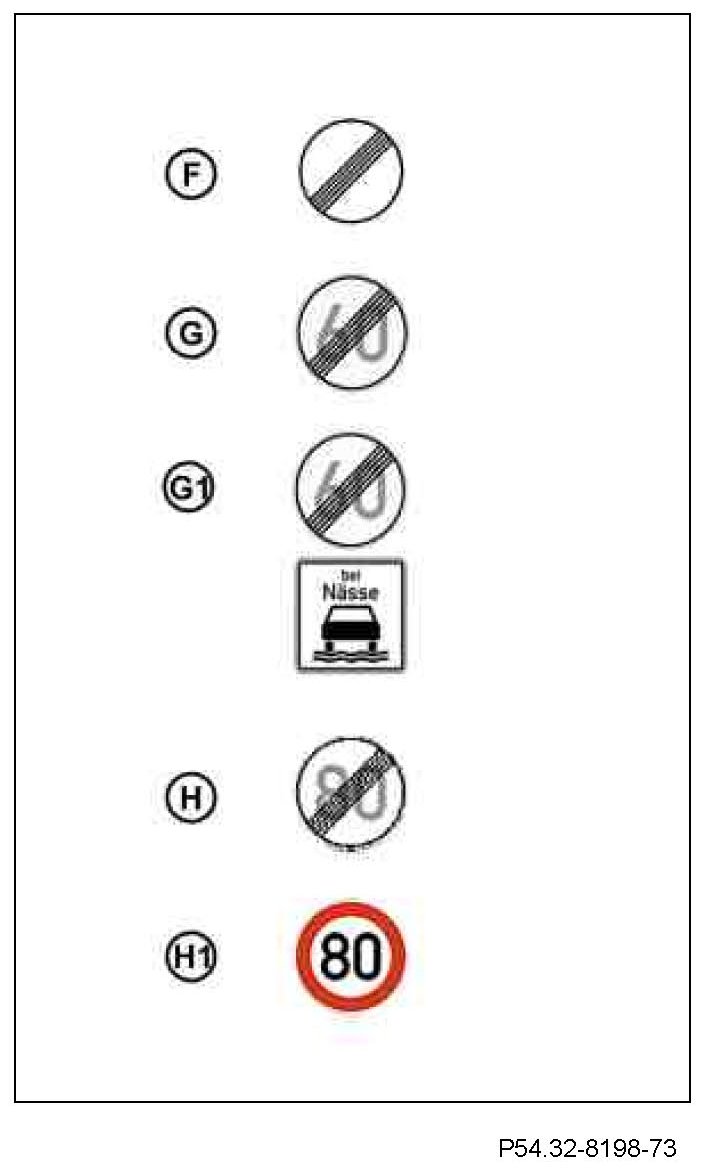 - Passing a derestriction sign with speed value (picture G) which deviates from the speed value of the traffic sign recorded in prior history (picture H1).