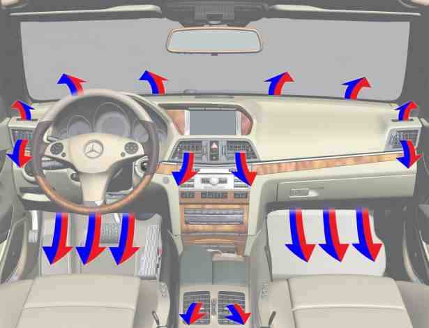 Depending on the current settings on the AAC [KLA] control and operating unit (N22/7), the air is routed into the vehicle interior through air ducts and air outlets.