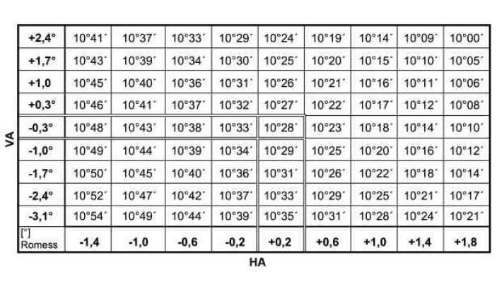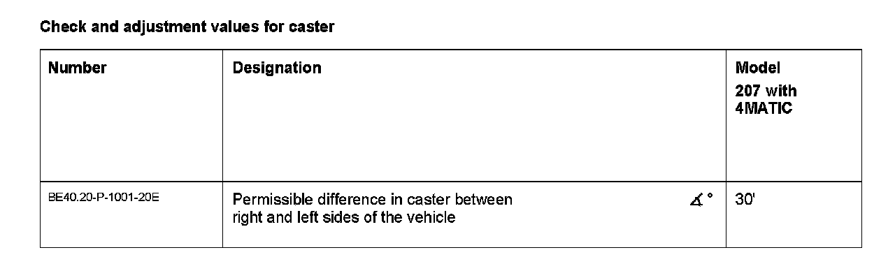 1 Obtain the caster value from the table taking into account the front axle (FA) level values and rear axle (RA) level values measured previously.