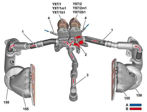 The exhaust for AGR is removed downstream of both catalytic converters for the left and right bank. The exhaust flows over the AGR lines to both exhaust gas recirculation valves.