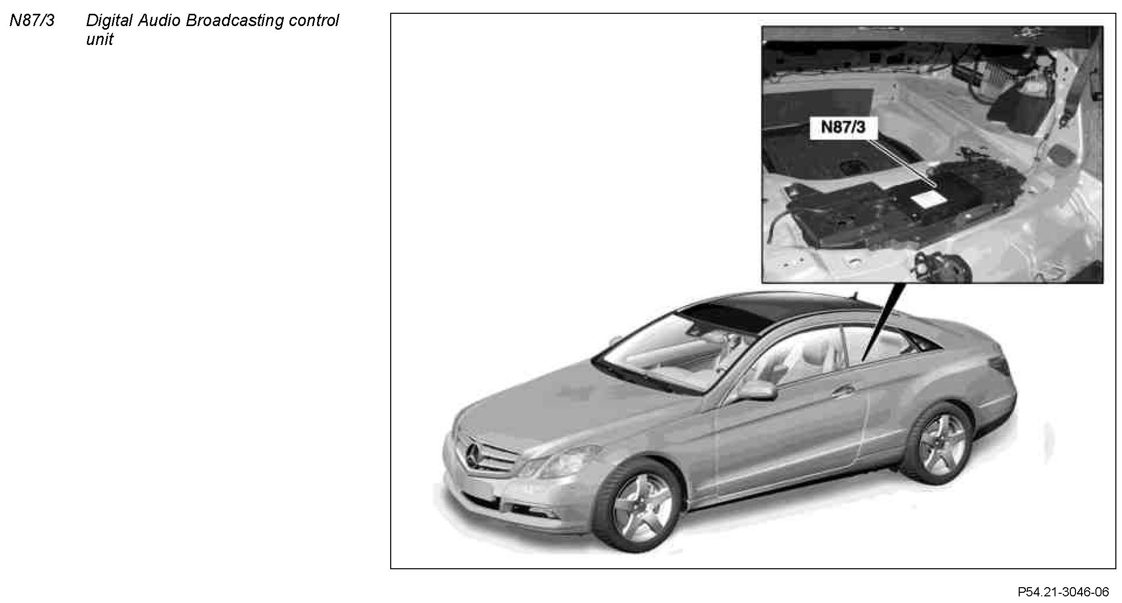 The Digital Audio Broadcasting control unit is located on the crossmember in the trunk beneath the paneling on the trunk floor.