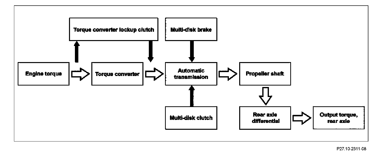 When the torque converter lockup clutch is engaged, power is transmitted via this mechanical connection. Via the gearwheels of the individual planetary gear sets the torques coming from the converter, depending on the gear ratio and shift elements actuated, are passed on to the transmission output shaft with the help of the multidisk clutches and multidisk brakes.