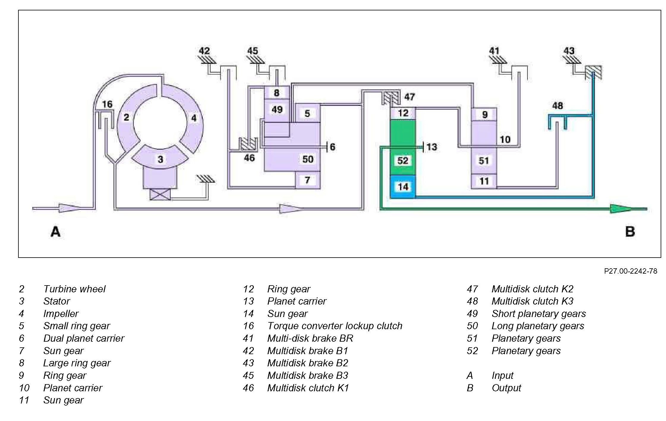Due to the engaged multidisk clutch K2 (47) the rotational speeds of ring gear (9) and ring gear (12) are the same. As a result the rear single planetary gear system is locked and not actively involved in the gear ratio.