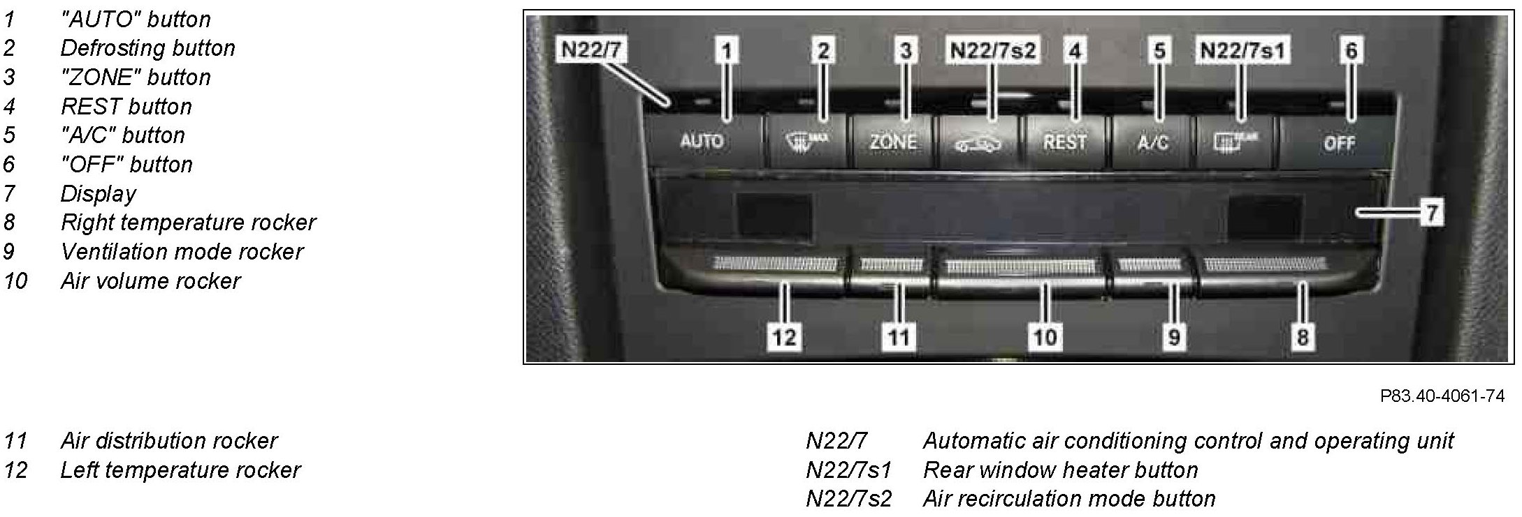 The LED for the air recirculation mode button lights up during operation. Pressing the air recirculation mode button for t > 1.5 s activates comfort air recirculation closing. The side windows and the tilting/sliding roof (SHD) (with code (414) Power glass tilting/ sliding roof) or the panoramic sliding sunroof (with code (413) Panoramic glass sunroof with top sliding sunroof) are then closed. When the air recirculation mode button is pressed again for t > 1.5 s, the side windows and the tilting/sliding roof or the panoramic sliding sunroof return to their previous positions.