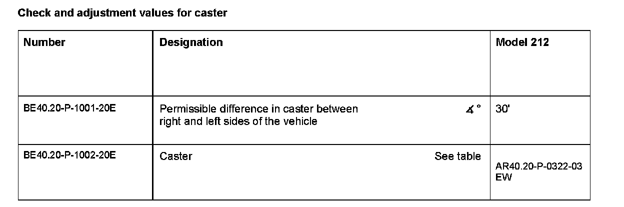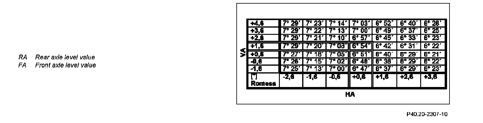 1 Obtain the caster value from the table taking into account the front axle (FA) level values and rear axle (RA) level values measured previously.