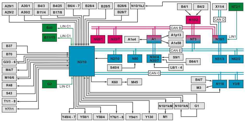 The ME-SFI [ME] control unit exchanges data with other control units via the connected drive train CAN and chassis CAN which are integrated in the CAN network.
