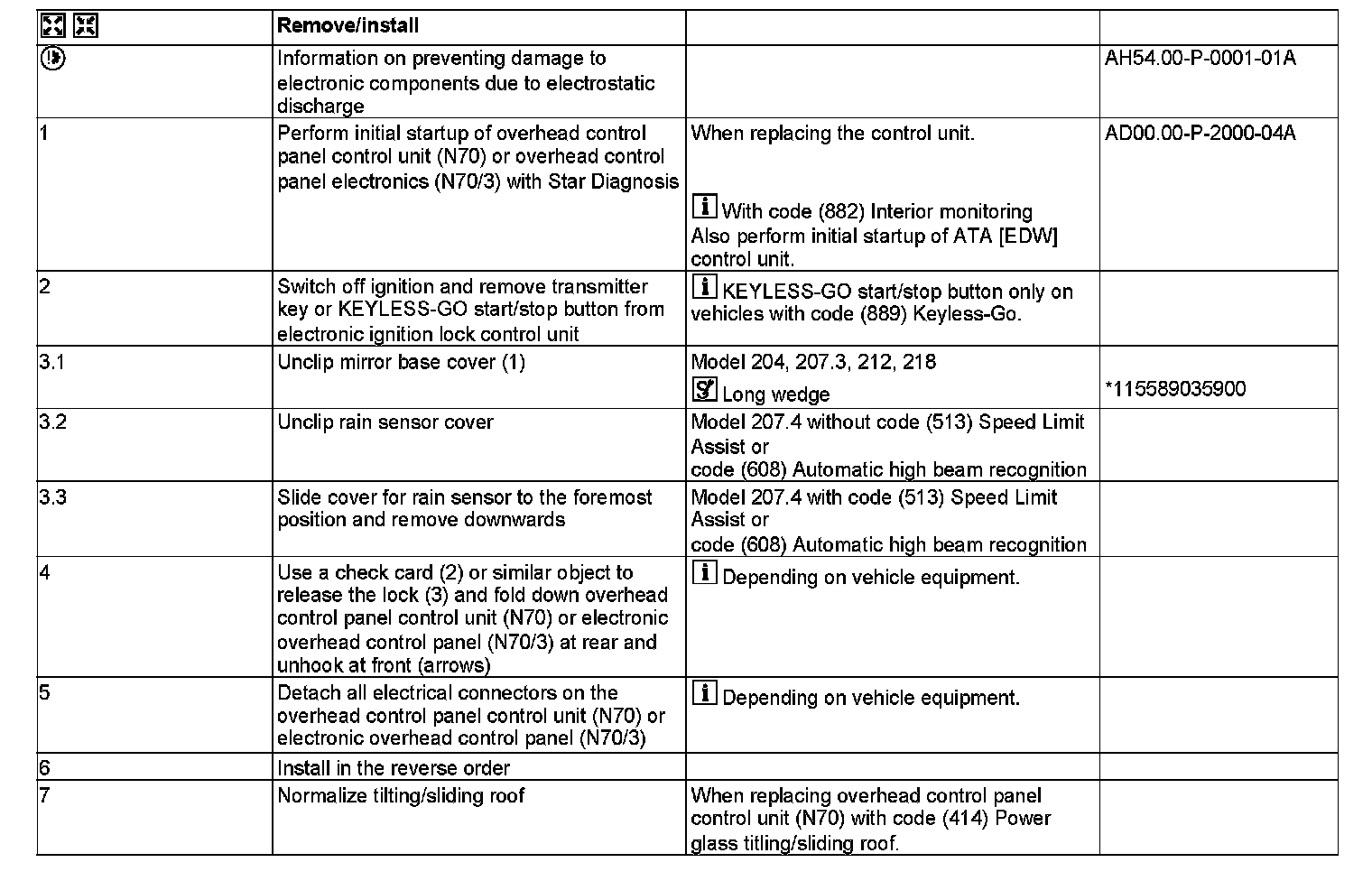 N70 Overhead control panel control unit (with code (414) Power glass tilting/sliding sunroof)
