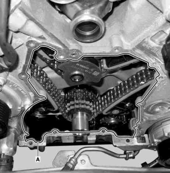 The sealant must be applied in the upper area of the timing case cutout in the center area of the sealing surface since sealant slides downwards due to placement of the timing case cover.