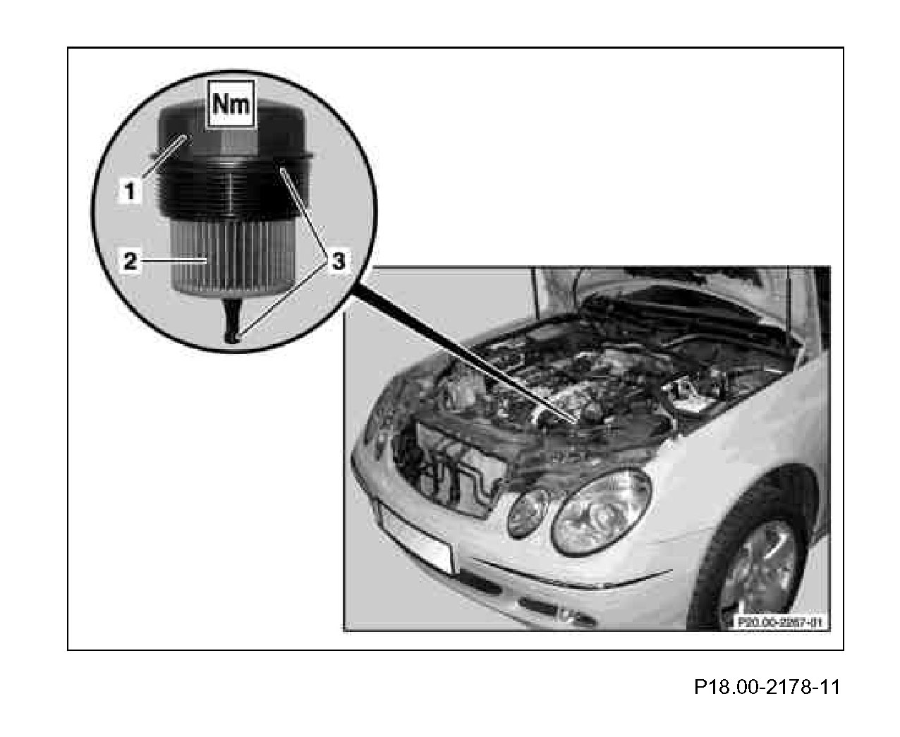 1 Remove screw cap (1) using socket and remove oil filter element (2).