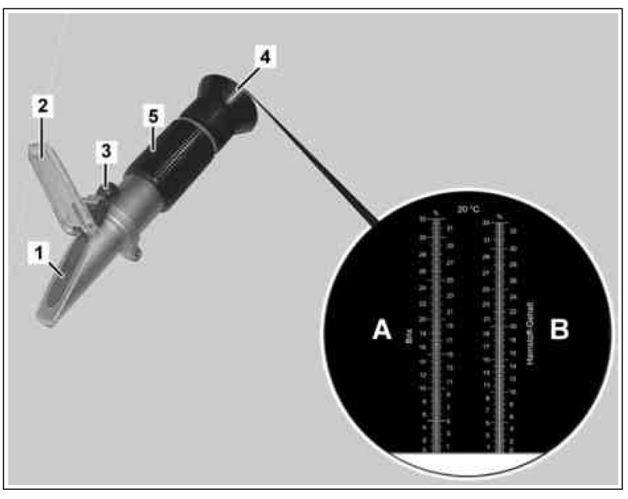 It is recommended to adjust the refractometer (5) before every checking procedure.