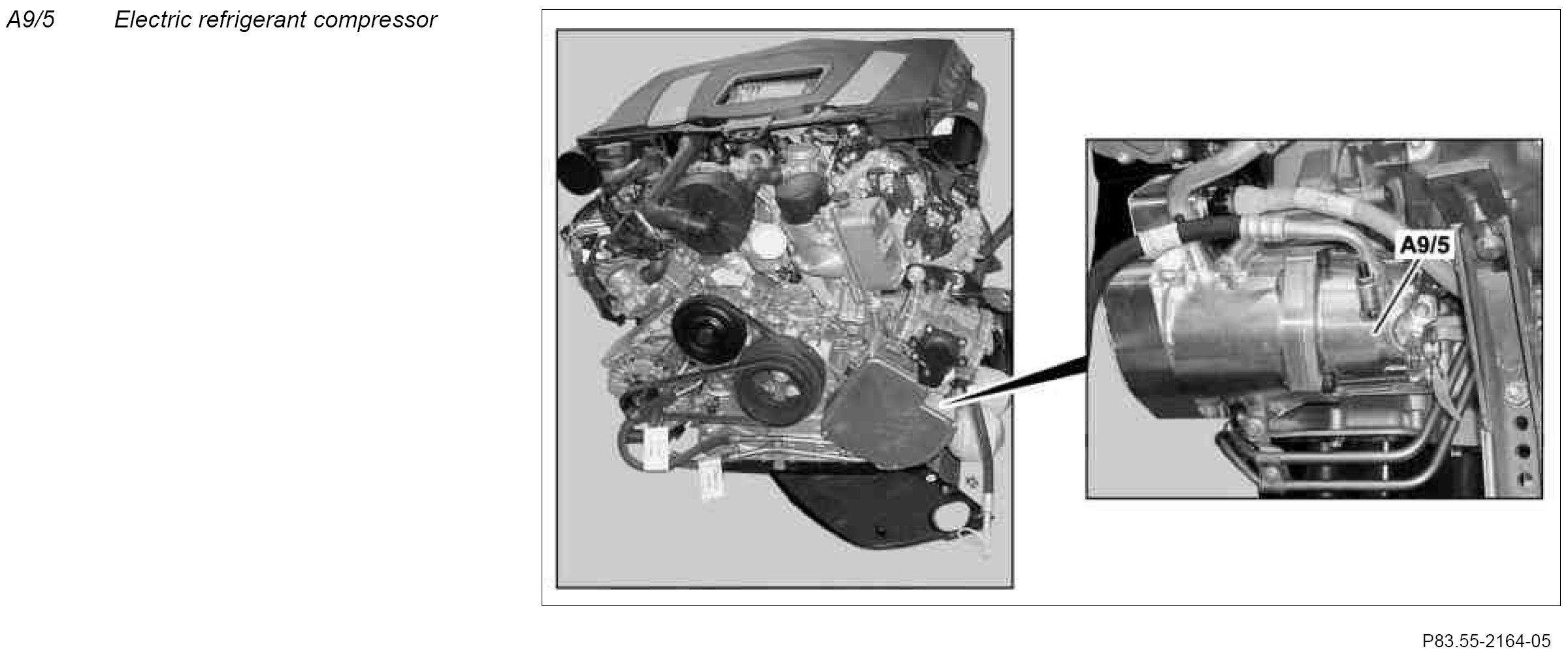 The electric refrigerant compressor is located at the bottom left on the engine.