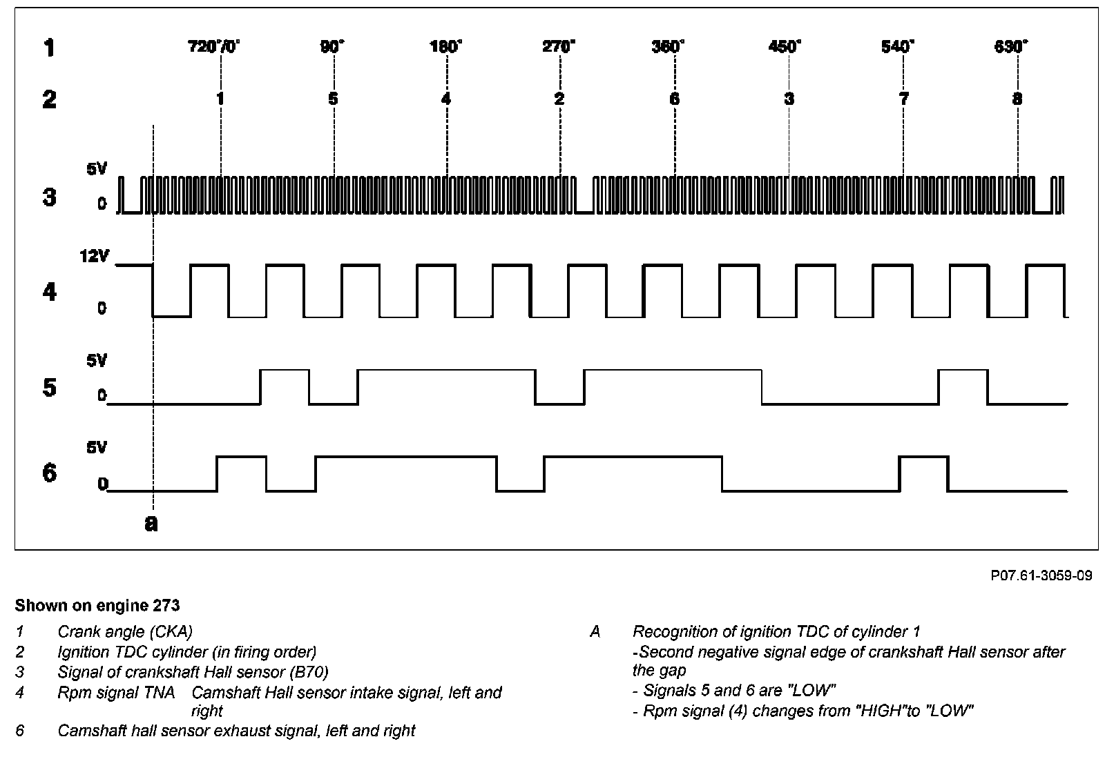 Four signals are generated per rotation of the camshaft whereby the signal switches between about 5 V ("HIGH") and 0 volt ("LOW"). If an opening in the pulse wheel is opposite the sensor, the signal is approx. 5 V.