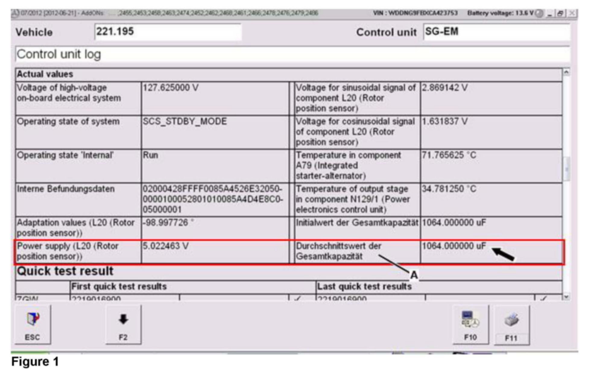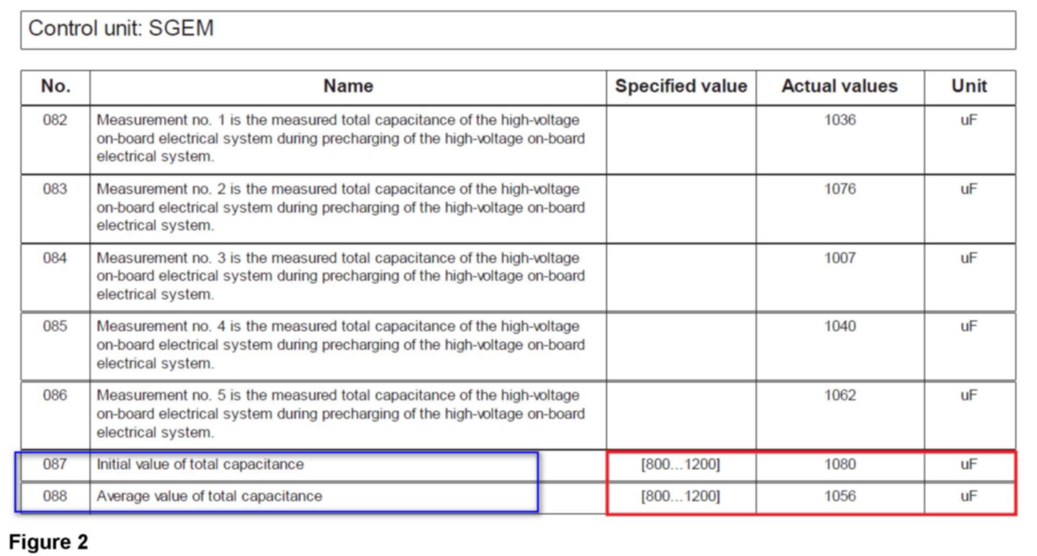 To do so, in electric motor control unit under "Current values" read off the value "Average value of total capacity" (arrow, Figure 1 [in screen display] and see also Figure 2 - field no. 088 [in control unit log print out]).
