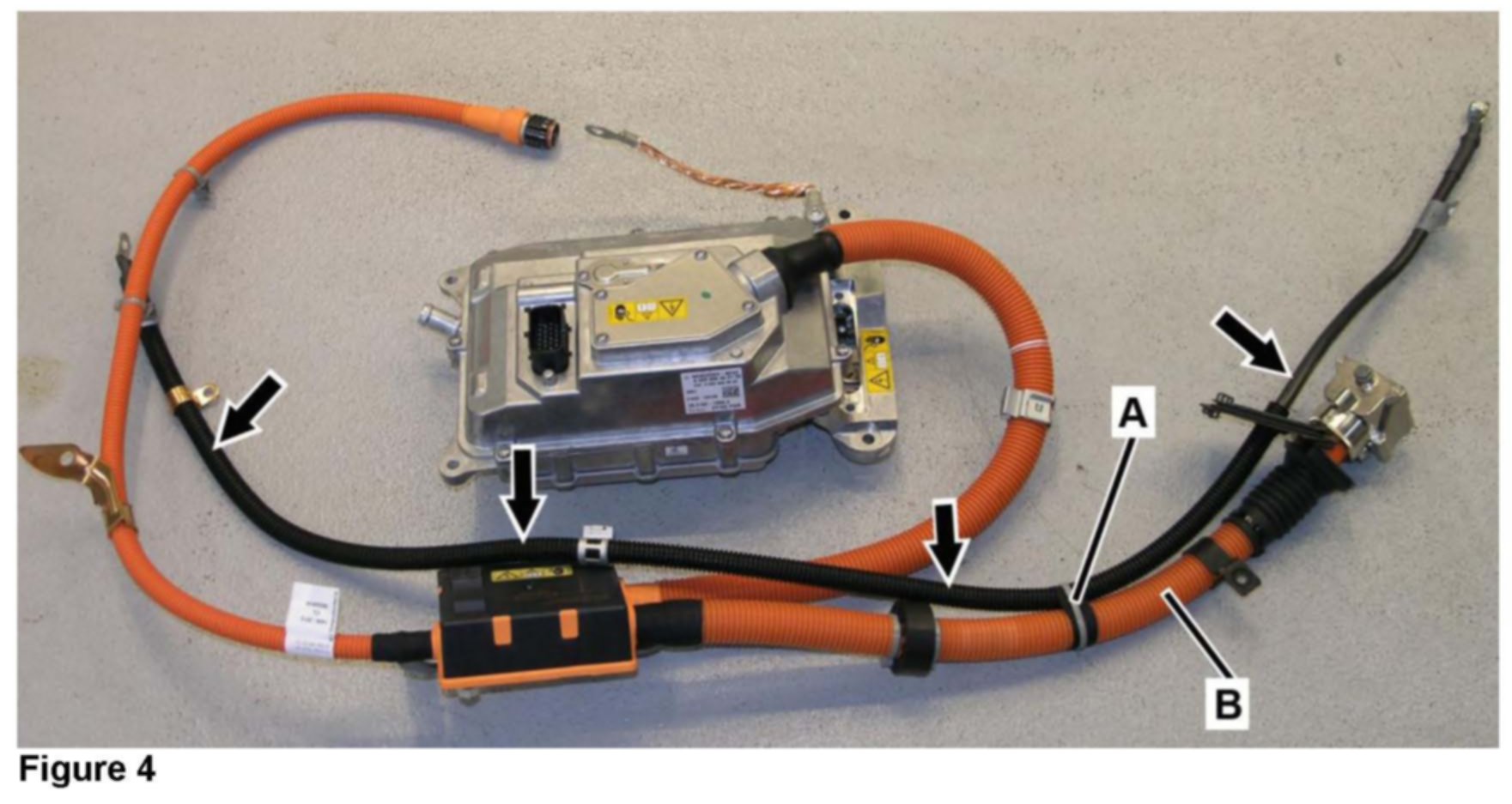 ^ Prior to installing new power electronics module, cut cable tie (A, Figure 4) and remove new alternator cable (arrows) attached to new power electronics module cable (B). The new alternator cable (arrows) does not get installed on vehicle.