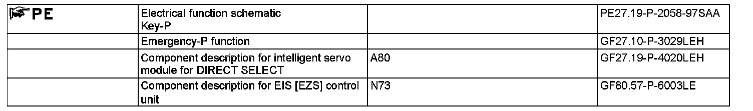 In order to ensure that after parking the vehicle the selector lever is automatically shifted into selector lever position "P" by the intelligent servo module for DIRECT SELECT (A80), in this position the transmitter key can only be turned towards "0" and removed from the EIS [EZS] control unit (N73). The vehicle is secured mechanically by blocking the park pawl gear in the transmission.