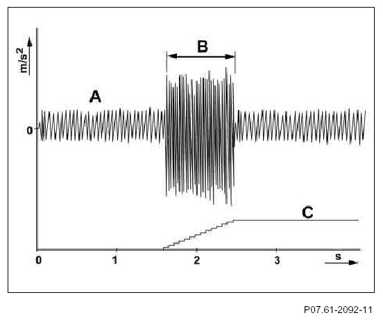 A Engine running without combustion misfiring -> Acceleration values within tolerance range (up to 3 m/s2 )
