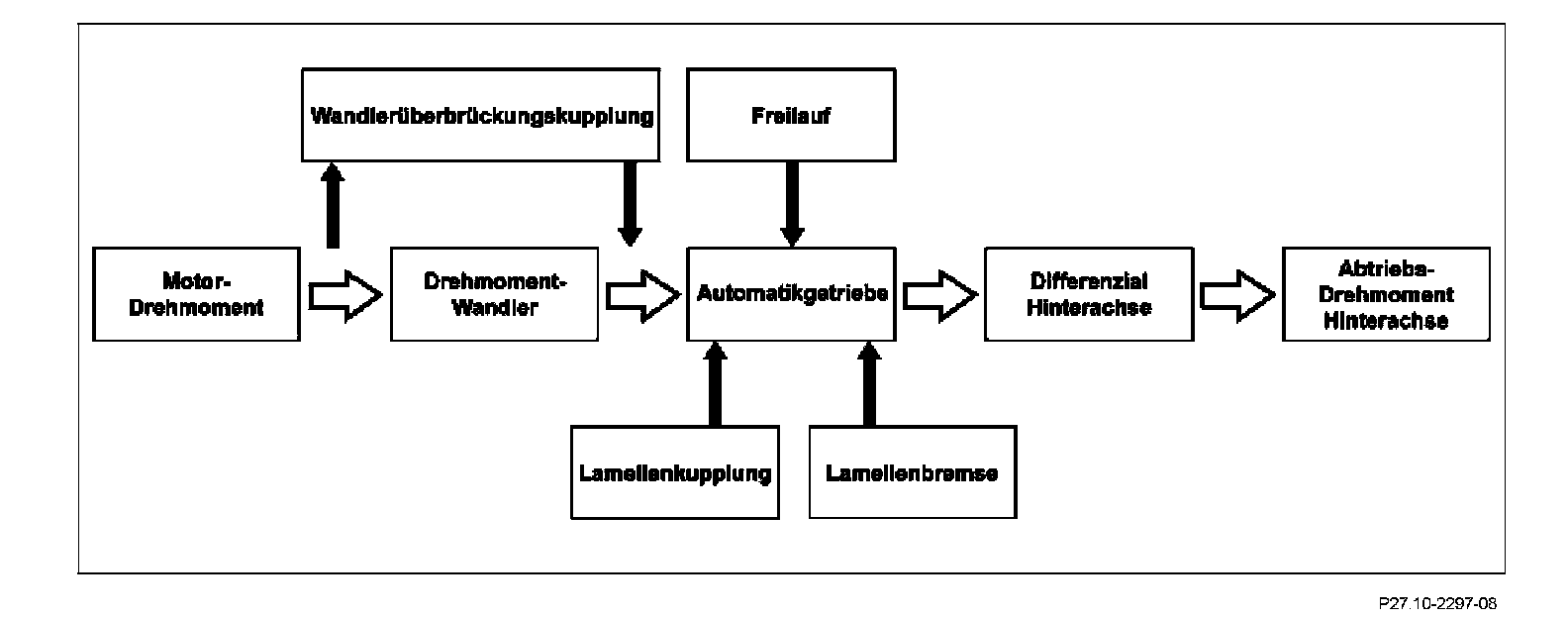The term "power flow" refers to the transmission paths of driving power and engine torques. The engine torques are transmitted to the drive wheels via the mechanical/hydraulic connection of the engine, torque converter, the downstream automatic transmission and the differential