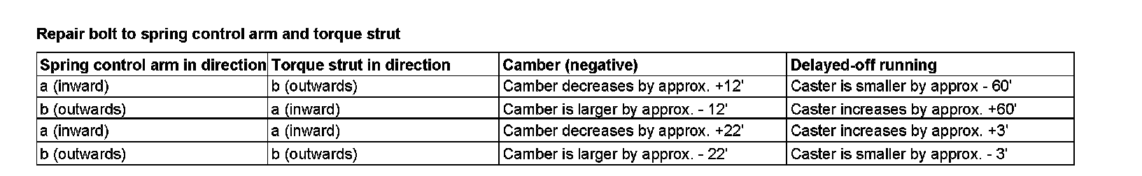 4 To adjust the camber and power-down, replace each standard bolt connection (A) to the torque strut (18) or spring control arm (17) with a repair bolt repair bolt (B).