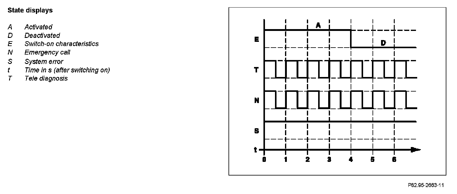 Every time TELE AID is switched on, the state display of the SOS pushbutton switch comes on for 4 s and thus signals TELE AID readiness. If there is no fault, the state display of the SOS pushbutton switch goes out after 4 s.